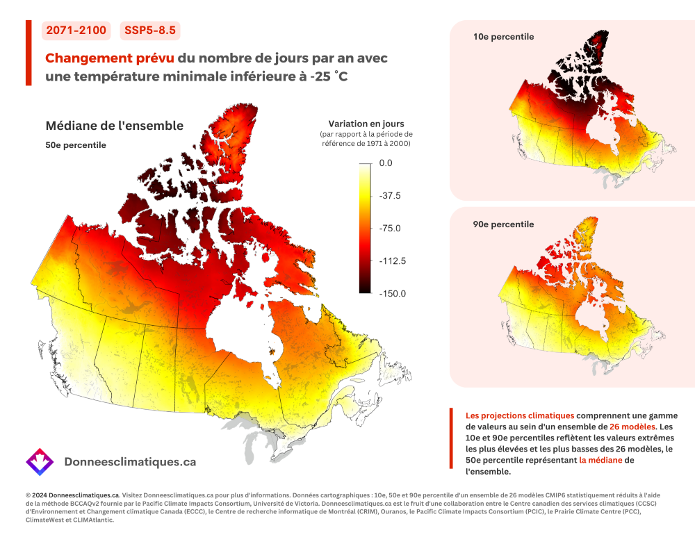 La grande carte principale montre la valeur médiane de l’ensemble multi-modèle, et les deux cartes plus petites montrent les percentiles 10e et 90e. Combinées, les trois cartes illustrent une gamme plus complète de changements projetés en terme de jours à -25 °C pour cette période future et ce scénario que ce que l’on pourrait obtenir à partir d’une seule carte. Pour en savoir plus sur les percentiles, lisez l’article de la Zone d’apprentissage sur les ensembles multimodèles.