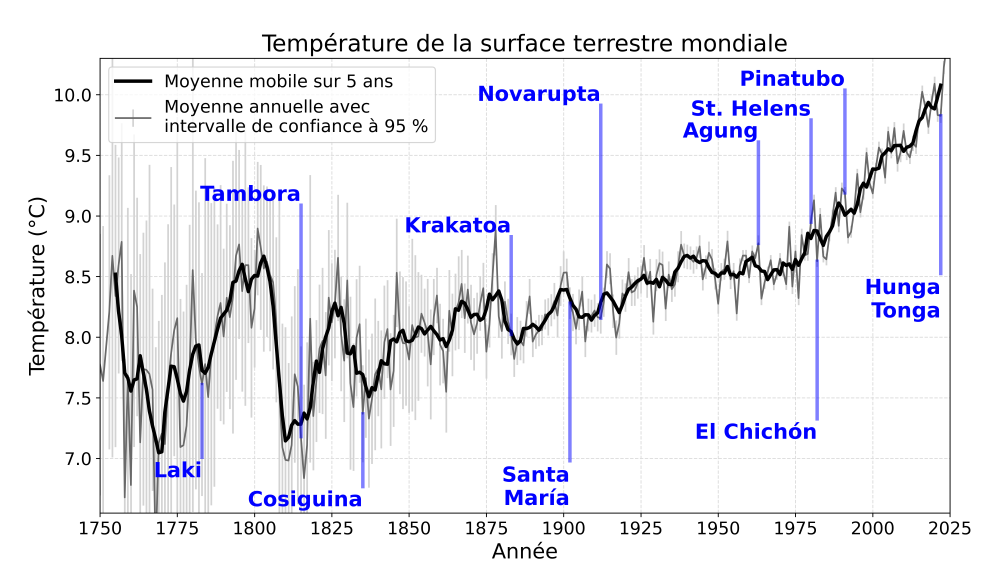 Les aérosols d’origine naturelle comprennent la poussière, la fumée des feux de forêt, les émissions volcaniques (cendres et sulfates) et les embruns2. Les aérosols d’origine humaine résultent de l’activité industrielle et de la combustion de combustibles fossiles et de bois. Deux types d‘aérosols ont une influence notable sur le climat: le carbone noir et les aérosols sulfatés. Le carbone noir est produit lors de la combustion du charbon, du gaz et du bois. Les aérosols contenant du carbone noir ont tendance à être sombres. Les aérosols de sulfate sont émis lors des éruptions volcaniques (encadré 2), de la combustion de combustibles fossiles et des processus industriels tels que la fusion. Ces aérosols ont tendance à être de couleur claire. Les aérosols de couleur foncée absorbent le rayonnement, ce qui entraîne un réchauffement de l’atmosphère; les aérosols de couleur claire réfléchissent le rayonnement, ce qui entraîne un refroidissement de l’atmosphère. Les aérosols sombres peuvent également provoquer un réchauffement supplémentaire lorsqu’ils se déposent sur la neige et la glace, car ils assombrissent la surface, ce qui entraîne l’absorption d’une plus grande quantité de rayonnement sur ces surfaces par ailleurs réfléchissantes.