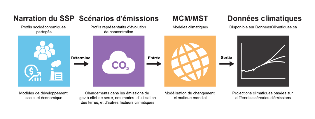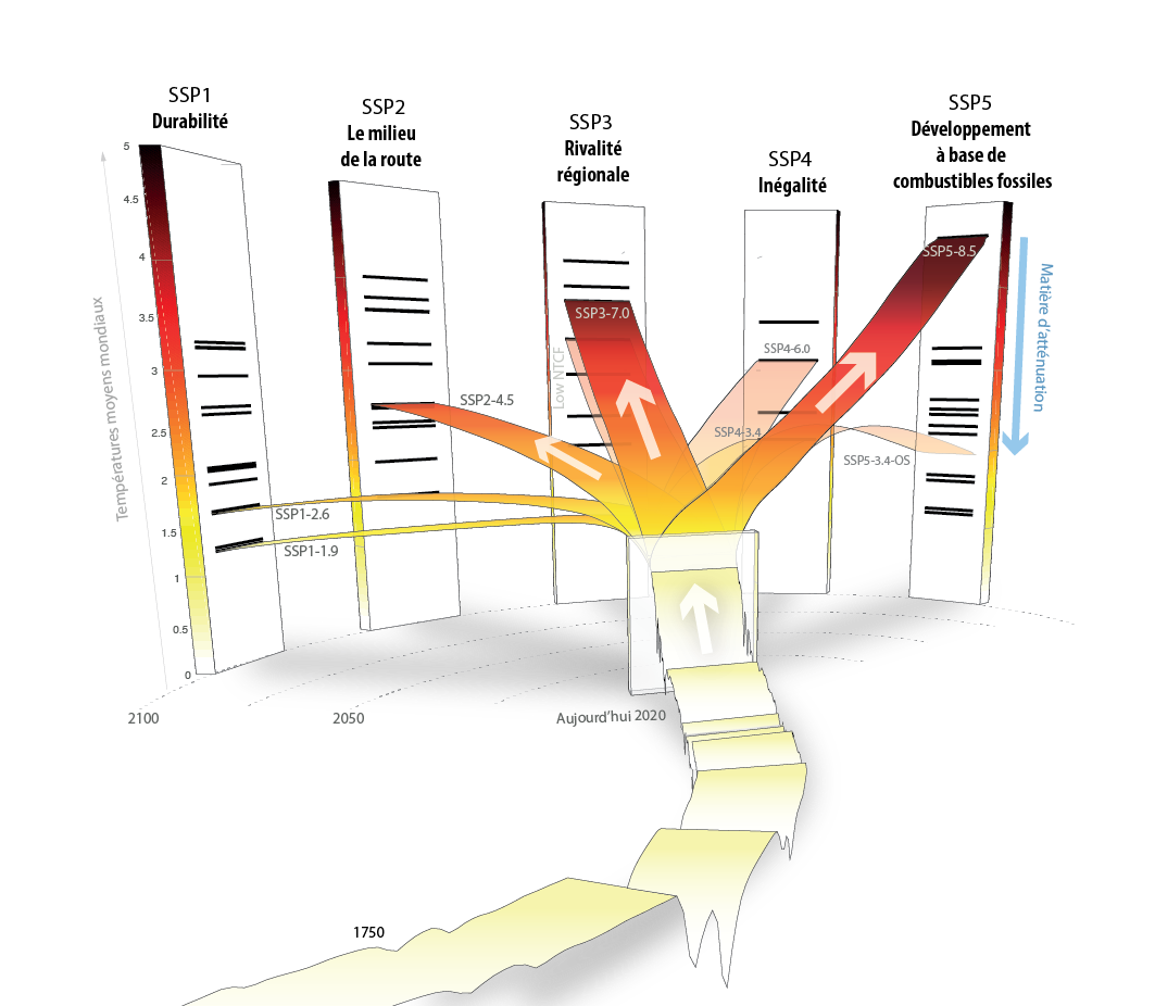 Les cinq « familles » de scénarios basés sur les SSP utilisés dans le CMIP6 peuvent être classées selon deux axes généraux : les défis en matière d’atténuation et les défis en matière d’adaptation (figure 1). La famille SSP1 (Durabilité) n’a que de faibles défis en matière d’atténuation et d’adaptation. Dans ces scénarios, les politiques s’axent sur le bien-être humain, les technologies d’énergie propre et la préservation de l’environnement naturel. À l’opposé, la famille SSP3 (Rivalité régionale) se caractérise par de grands défis en matière d’atténuation et d’adaptation. Dans ces scénarios, le nationalisme oriente les politiques et l’accent est mis sur les problèmes régionaux et locaux plutôt que mondiaux. Les autres SSP « remplissent le spectre » des avenirs possibles. La famille SSP4 (Inégalités) est définie par de grands défis en matière d’adaptation et de faibles défis en matière d’atténuation; la famille SSP5 (Développement par les énergies fossiles), par de grands défis en matière d’atténuation et de faibles défis en matière d’adaptation; et la famille SSP2 (À mi-chemin), par des défis moyens en matière d’atténuation et d’adaptation.