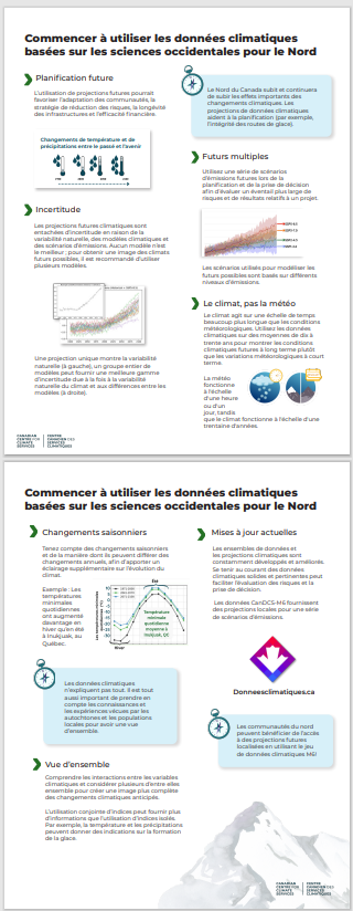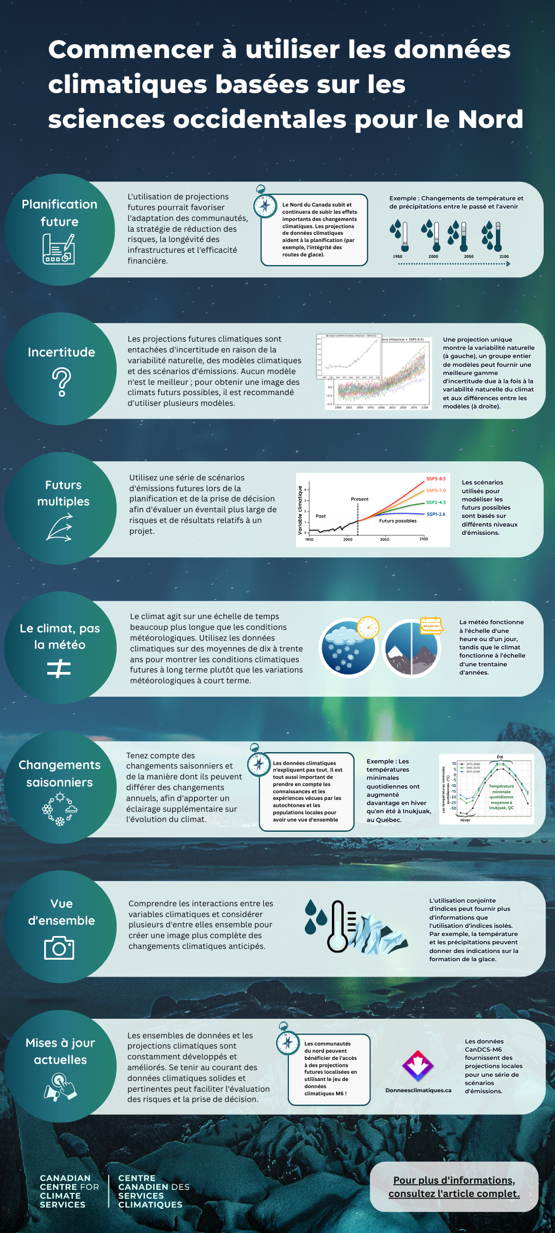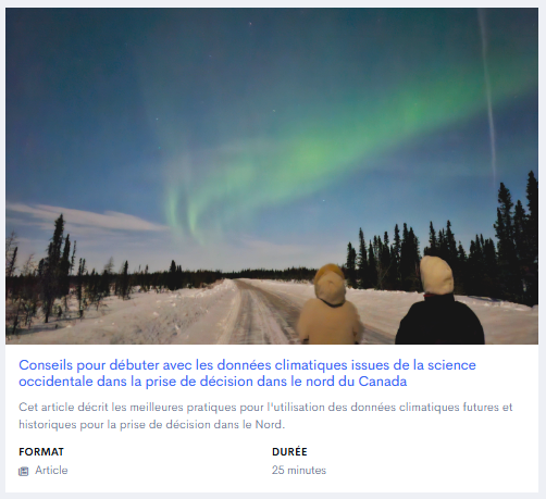 L’intégration des données climatiques fondées sur la science occidentale dans la prise de décision favorise une adaptation fondée sur des preuves dans le nord du Canada. Suivez ces conseils lorsque vous utilisez des données climatiques pour prendre des décisions éclairées et intelligentes sur le plan climatique qui renforcent la résilience et la durabilité face à un climat en changement. Si vous démarrez un projet, si vous avez des questions sur l’utilisation des données climatiques, ou si vous souhaitez confirmer si vous utilisez les bonnes données, vous pouvez obtenir l’aide d’experts (gratuitement) auprès du Centre d’aide des Services Climatiques, accessible via Donneesclimatiques.ca ou le Centre canadien des services climatiques.