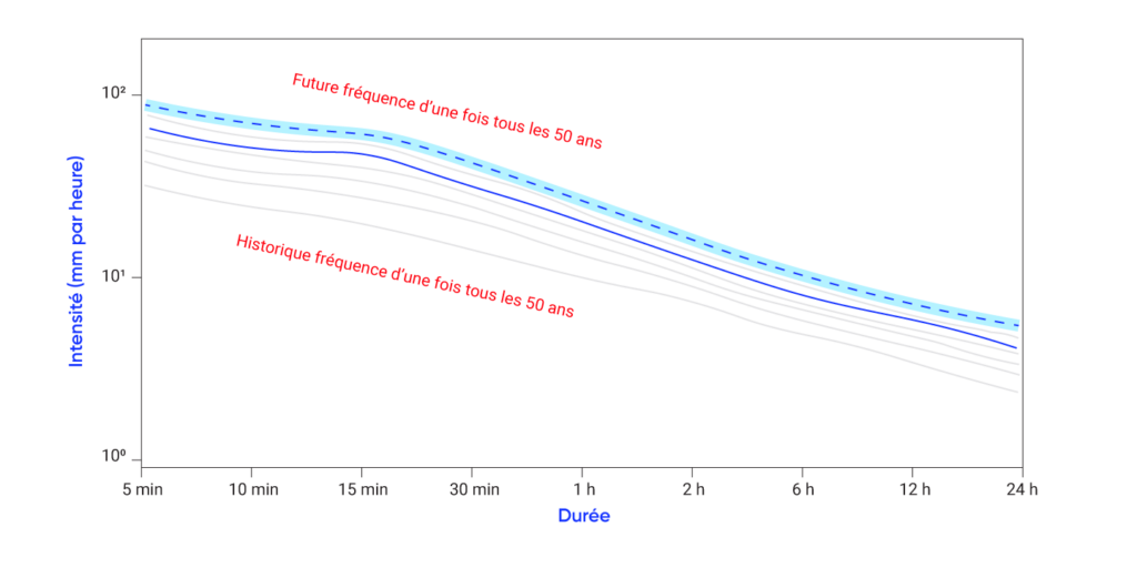 Les changements climatiques ont intensifié les événements pluvieux extrêmes en Amérique du Nord et cette intensification devrait se poursuivre à l’avenir. Toutefois, il demeure difficile d’effectuer des projections de précipitations illustrées sur les graphiques IDF en raison de la rareté des observations de pluies extrêmes, des difficultés à modéliser les événements de précipitations extrêmes locaux et de la variabilité climatique.