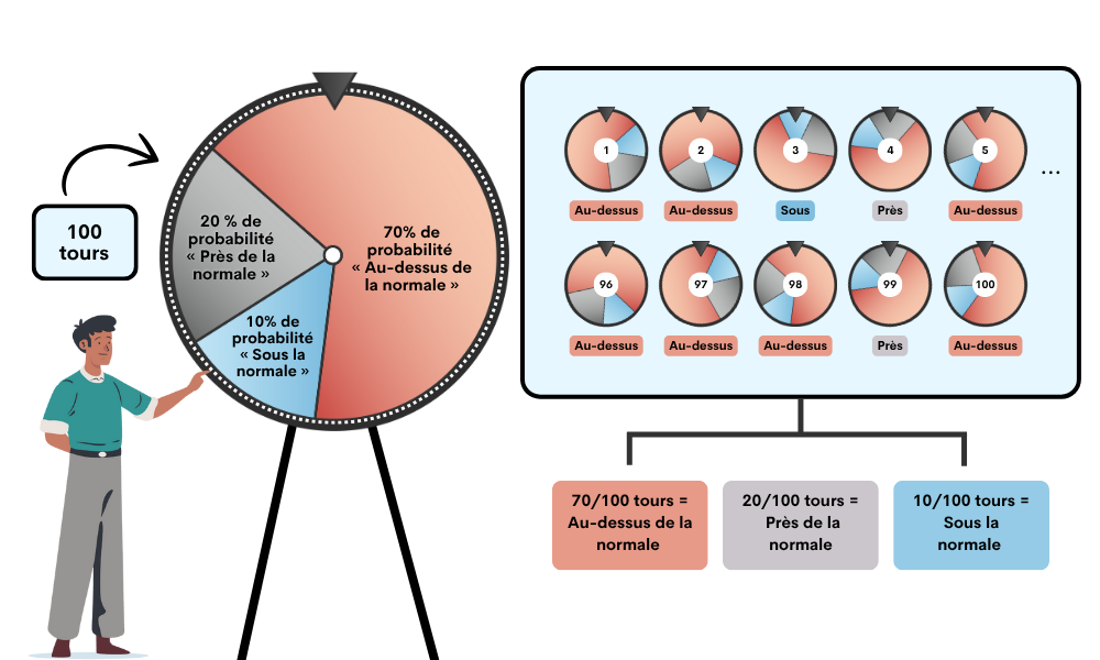 Donneesclimatiques.ca offrira des prévisions qui couvrent des périodes mobiles de trois mois sur les 12 prochains mois. Des prévisions mensuelles seront également disponibles pour les trois premiers mois. Par exemple, le 1er juin 2026, des prévisions saisonnières seront publiées pour les mois de juin à août 2026, de juillet à septembre 2026, d’août à octobre 2026, et ainsi de suite, la dernière prévision disponible étant celle de mars à mai 2027. Des prévisions mensuelles seront publiées pour les mois de juin, juillet et août 2026. La figure 4 montre des exemples de périodes de prévisions saisonnières.