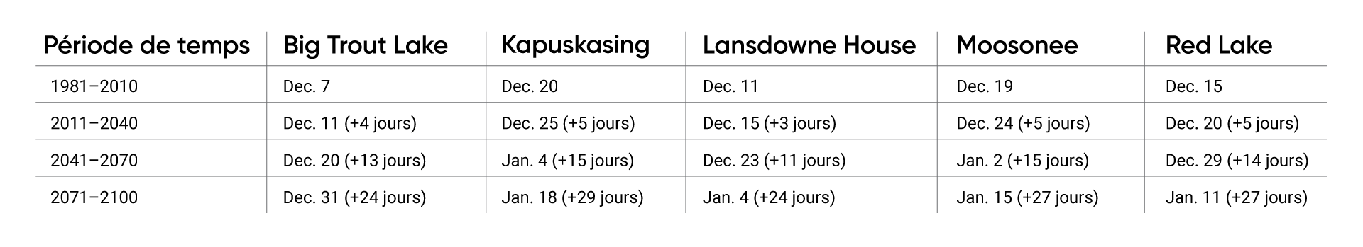Lorsqu’on évalue les tendances des accumulations de DJG à partir du 1er octobre, on projette que l’accumulation de 380 DJG se produira plus tard dans l’année pour toutes les communautés pour tous les scénarios d’émissions de gaz à effet de serre, par rapport aux conditions historiques. Par exemple, en utilisant le scénario d’émissions élevées (RCP 8.5), le début de la construction des routes de glace, d’ici la fin du siècle, pourraient avoir lieu entre trois et quatre semaines plus tard pour les cinq communautés (tableau 1). Cette analyse est basée sur la date médiane à laquelle les accumulations de DJG atteignent 380 DJG depuis le début de la période de préconditionnement (1er octobre). Pour Moosonee, Red Lake et Kapuskasing, l’implication de cette période de gel plus tardive est que la construction ne pourrait commencer qu’à la mi-janvier. Pour Big Trout Lake et Lansdowne House, les dates de début de la construction pourraient être reportées à la fin décembre et au début janvier, respectivement.