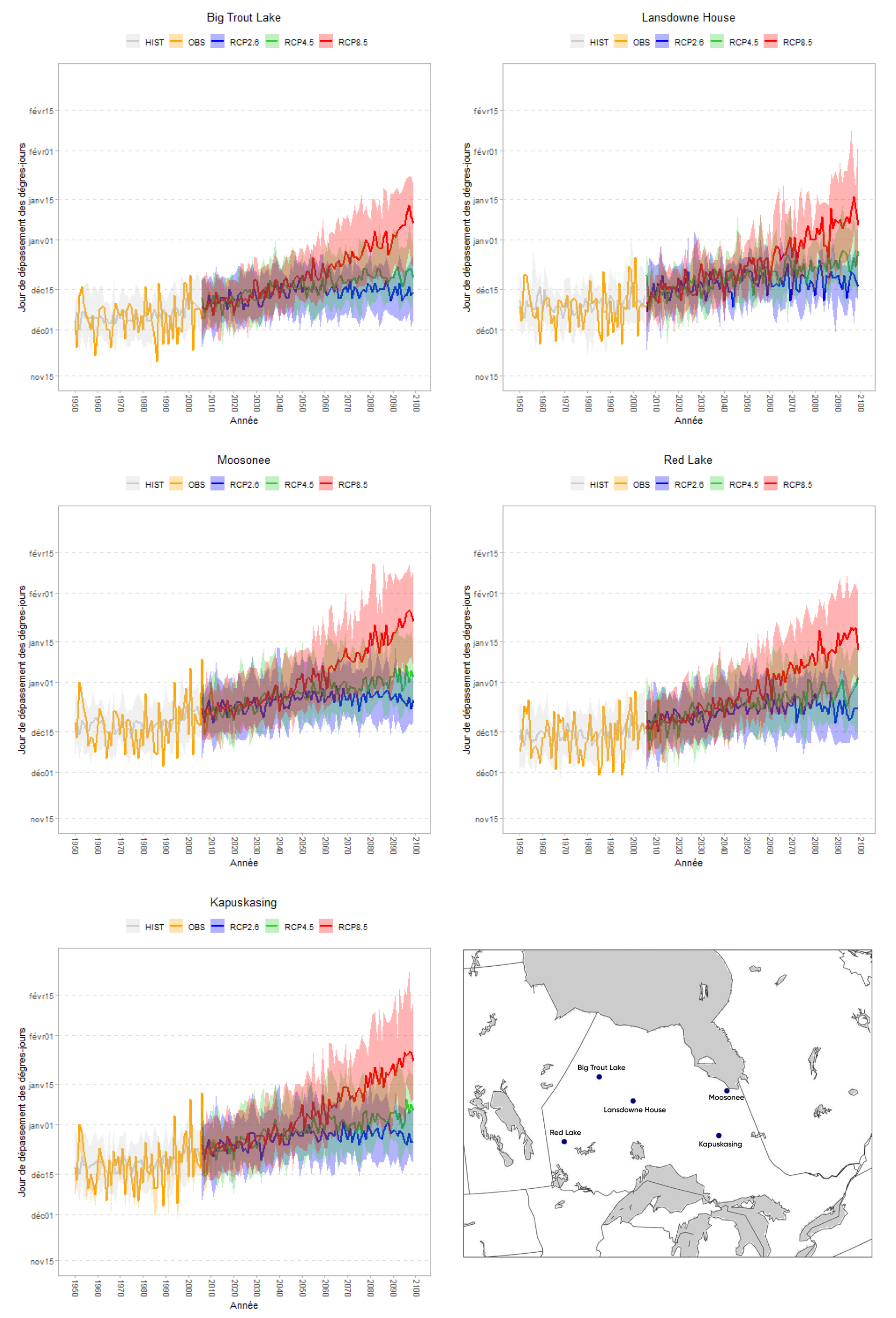 Ci-haut à gauche : Jour de l’année où les cumuls de DJG (Tmoyen ≤ 0 °C) sont supérieurs à 380 (à partir du 1er octobre) pour Big Trout Lake, Lansdowne House, Moosonee, Red Lake et Kapuskasing. Différentes couleurs réfèrent à différents scénarios d’émissions futures (RCP), les lignes épaisses indiquent la médiane multimodèles et un ombrage plus clair indique la plage multimodèles. Les données historiques interpolées sur grille (ANUSPLIN) sont indiquées par une ligne continue orange, les données historiques modélisées sont affichées en gris. Voir l’encadré pour des informations importantes sur la comparaison entre les données historiques et les données projetées.