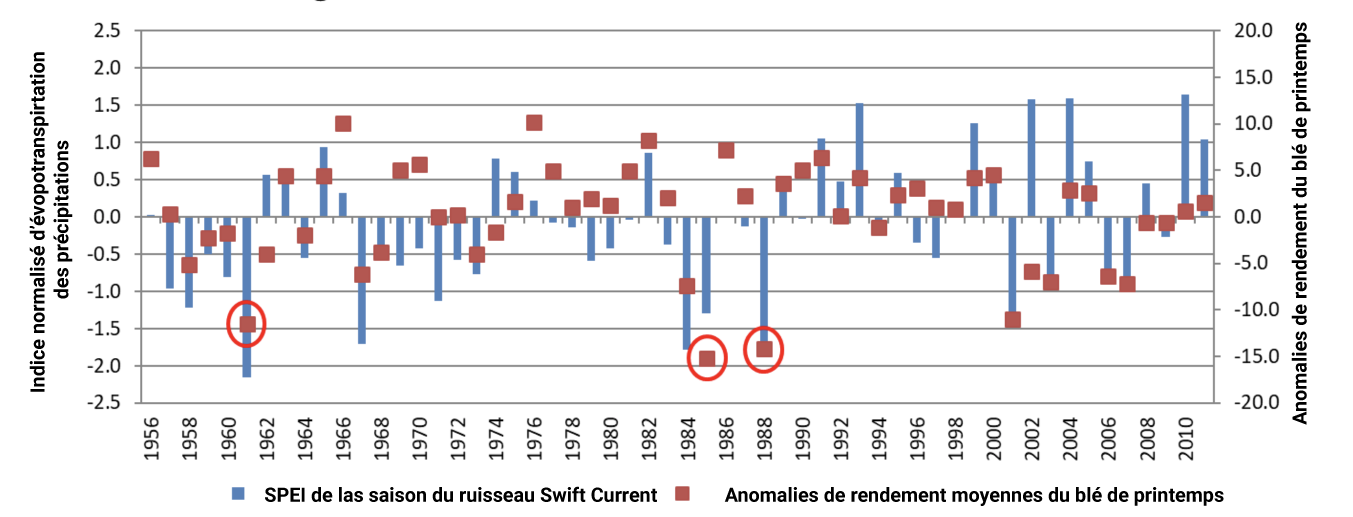 De nombreuses autres sécheresses importantes se sont produites au Canada, en particulier dans les Prairies. Au moins dix grandes sécheresses ont frappé, y compris celles de 1910-11, 1914-15, 1917-20, 1928-30, 1931-32, 1936-38, 1948-51, 1960-62, 1988-89 et 2001-032 (Figure 1). Ces sécheresses s’échelonnant sur plusieurs années et sur de grandes superficies causent beaucoup plus de dégâts que des sécheresses plus courtes et présentent, par le fait même, de plus grands défis d’adaptation. Plusieurs sécheresses plus récentes ont également été documentées. La sécheresse extrême de 2015 en Colombie-Britannique, en Alberta et en Saskatchewan est remarquable, puisqu’elle a été en partie attribuée aux changements climatiques. Les sécheresses peuvent couvrir de vastes superficies non seulement au Canada, mais aussi sur de grandes parties de l’Amérique du Nord et ailleurs, elles ont été très intenses et de longue durée3.