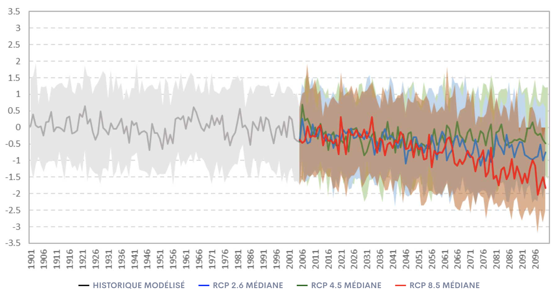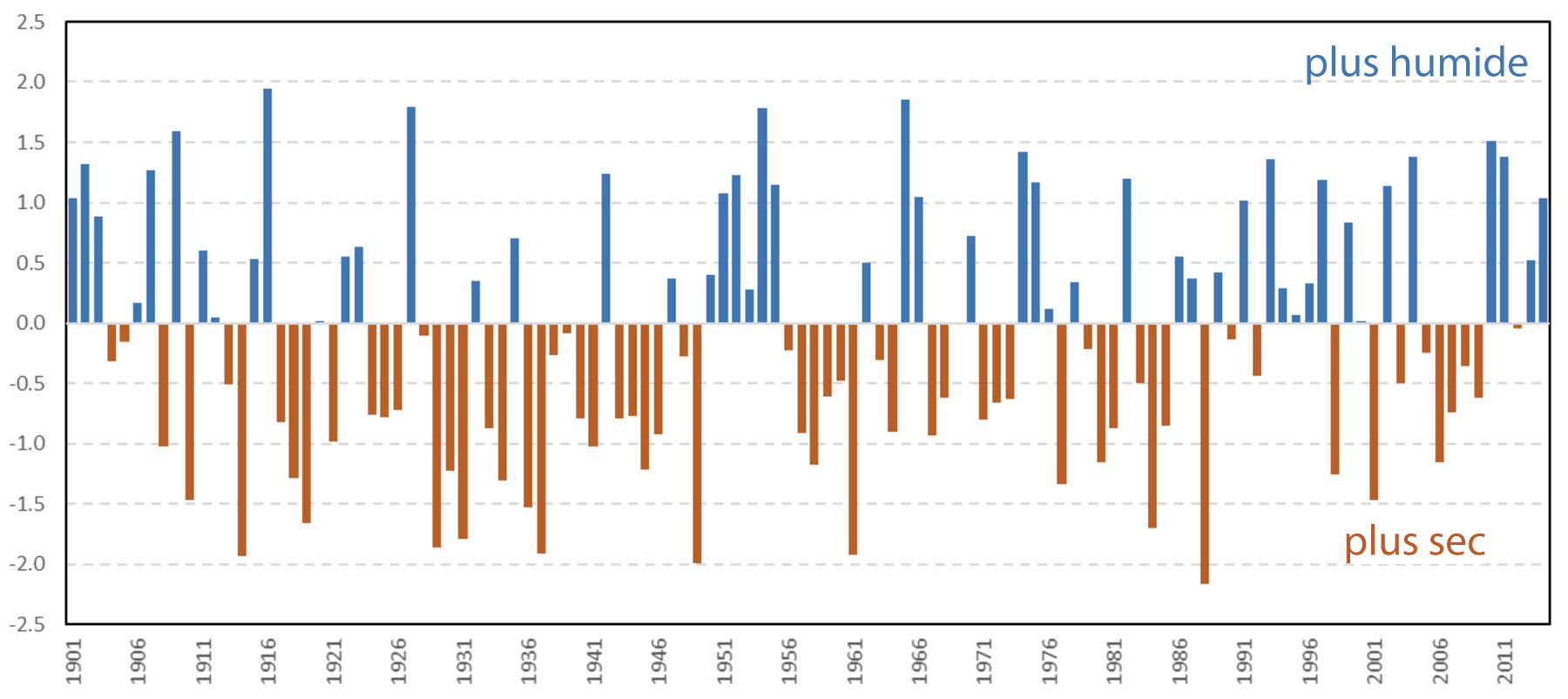 Plusieurs mesures sur la sécheresse sont utilisées, y compris l’indice de précipitations et d’évapotranspiration normalisé (ou Standardized Precipitation Evapotranspiration Index – SPEI). Le SPEI est un indice relativement simple basé sur l’équation du bilan hydrique (précipitations moins évapotranspiration potentielle) qui peut être utilisé pour calculer la sécheresse à plusieurs échelles de temps (par exemple, un, trois, six, neuf et douze mois) pour la période historique ainsi que pour le futur (en utilisant les résultats de modèles climatiques). Étant donné que cet indice inclut l’évapotranspiration potentielle, les effets de l’augmentation des températures projetée dans le futur peuvent également être inclus.