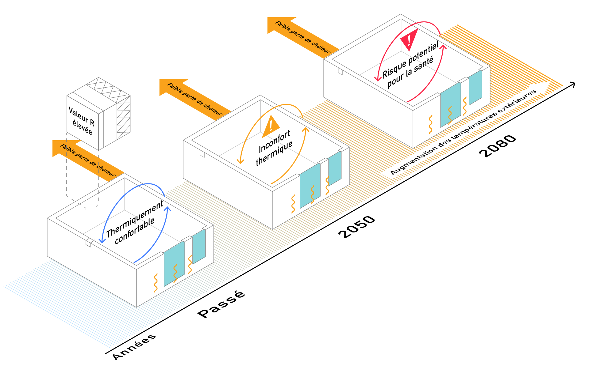 En examinant les projections climatiques à long terme de PCIC, Adams et son équipe ont également réalisé que d’ici 2080, leur conception ne serait plus en mesure de répondre aux exigences de refroidissement des espaces afin de maintenir les occupants dans un niveau de confort thermique sain (figure 1). Cette constatation a donné lieu à un débat sur la question à savoir s’il fallait revoir complètement la conception (ce qui occasionnerait une augmentation substantielle des coûts pour un autre système de refroidissement), ou s’il fallait postposer les mesures à prendre, étant donné que les changements potentiels des exigences en matière de construction dans six décennies sont largement inconnus. La révision serait beaucoup plus coûteuse et nécessiterait un tout autre type d’équipement mécanique. L’équipe a conclu que l’ajout d’un système de refroidissement alternatif nécessiterait des sacrifices majeurs à la fonctionnalité de base du bâtiment afin de l’intégrer dans le budget du projet, et n’était donc pas financièrement réalisable pour le moment.